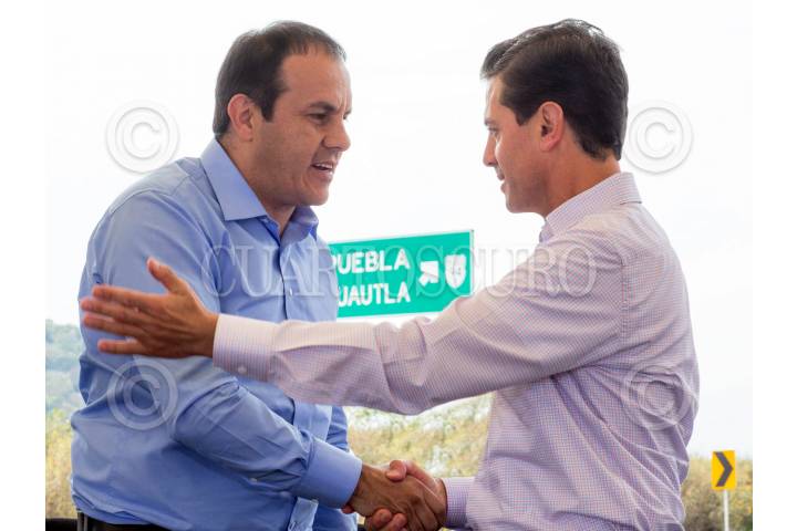 TLALQUILTENANGO, MORELOS, 26NOVIEMBRE2018.-En el evento en el que entregó la Autopista Siglo XXI, el Presidente Enrique Peña Nieto aseguró que la Administración que encabezó ha hecho su contribución al objetivo de que México sea una mejor nación. Dijo que los logros de una Administración no pueden atribuirse en exclusiva a una persona o a un equipo, sino que son logros de todo un país. En la imagen el Jefe del Ejecutivo saluda al gobernador de Morelos, Cuauhtémoc Blanco. FOTO: PRESIDENCIA /CUARTOSCURO.COM