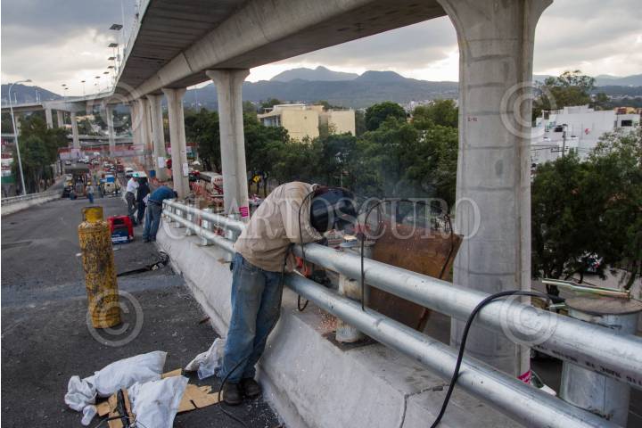 CIUDAD DE MÉXICO, 02FEBRERO2024.-Luego de diversas denuncias por parte de automovilistas autoridades capitalinas, policía de tránsito y encargados de la Autopista Urbana acudieron a inspeccionar la zona de desprendimiento del puente que desemboca en Calzada de Tlalpan. FOTOS: ROGELIO MORALES /CUARTOSCURO.COM