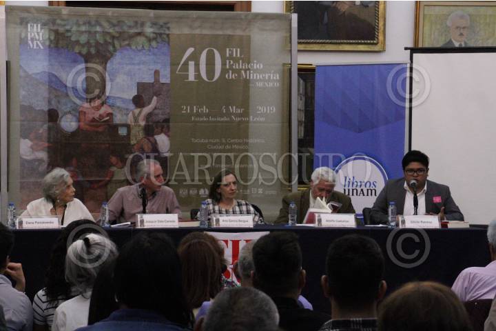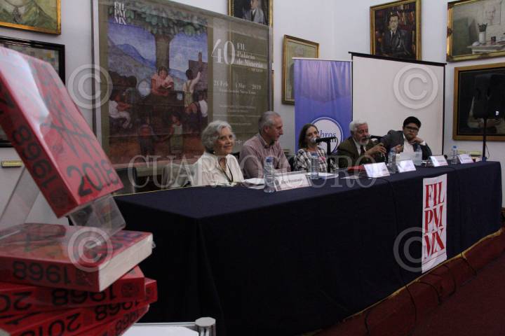 CIUDAD DE MÉXICO, 22FEBRERO2019.- Elena Poniatowska, Joaquín Diez Canedo, Ana Garcia Bergua, Adolfo Castañón y Gibrán Ramírez, en la Galería de Rectores del Palacio de Minería, durante la presentación del libro 1968-2018 Historia Colectiva de Medio Siglo, el cual narra la diversas historias de impunidad después de la masacre estudiantil del 68. FOTO: ROGELIO MORALES /CUARTOSCURO.COM