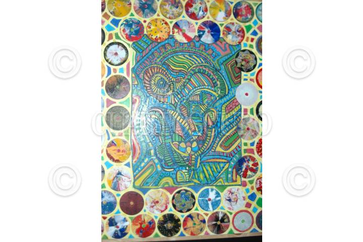 ECATEPEC, ESTADO DE MÉXICO, 07FEBRERO2009.- En el exterior del salón de los Nueve Pueblos (dentro del palacio municipal de Ecatepec), se inició la exposición de Manuel de Jesús Berzunza, quien nació el 25 de diciembre de 1956, quien desde muy temprana edad padece de esquizofrenia paranoide y pese a caer en crisis, lo que trunco por algunos años su carrera artística, logró retomarla con ayuda de la Asociación de Familiares y Amigos de Pacientes Esquizofrénicos (A.F.A.P.E.). Ha presentado sus obras en distintas muestras nacionales, llamando la atención de psicólogos y psiquiatras por lo que expresan sus trabajos con carácter expresionista, experimental, y sicodelia. En la imágen un collage de Manuel Berzunza, titulada "Autorretrato". FOTO: MARIO NULO/CUARTOSCURO.COM