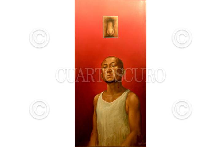 QUERETARO, QUERETARO. 20SEPTIEMBRE.-El pintor Queretano Raúl Gracía Sangrador, denunció ante medios de comunicación el acto de censura que sufrió por parte del Instituto Municipal de Cultura a través de la galería municipal donde se expone su obra. En la imagen su obra censurada "Autorretrato". FOTO: RAÚL GARCÍA/Oleo Sobre tela, pintura.