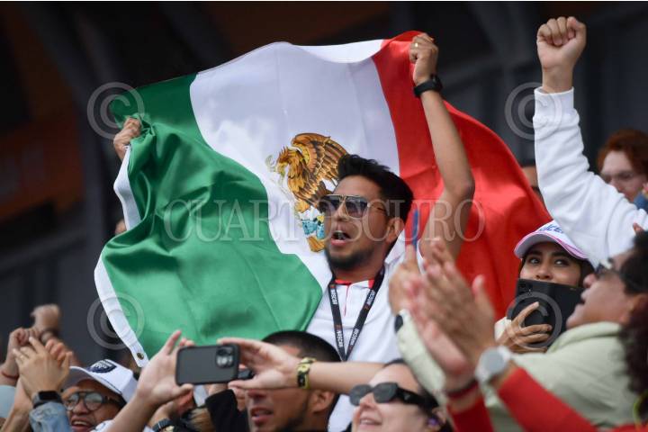 CIUDAD DE MÉXICO, 14JUNIO2025.- Aficionados celebran el triunfo del piloto mexicano Daniel Suárez, durante la carrera "The Chilango" de Nascar Xfinity Series llevada a cabo en el Autódromo Hermanos Rodríguez. FOTO: MARIO JASSO/ CUARTOSCURO.COM