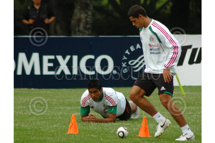 AVÁNDARO, ESTADO DE MÉXICO, 22ABRIL2010.- Alberto Medina y Javier Hernández durante el entrenamiento de la selección mexicana de fútbol en el Club de Golf Avándaro. FOTO: IVAN STEPHENS/CUARTOSCURO.COM