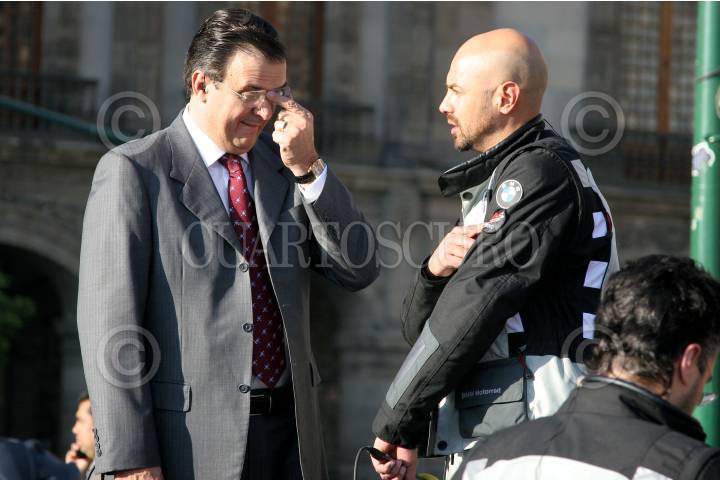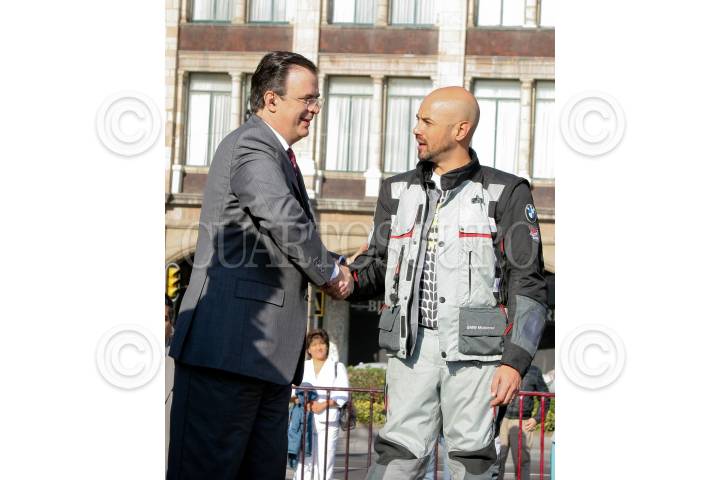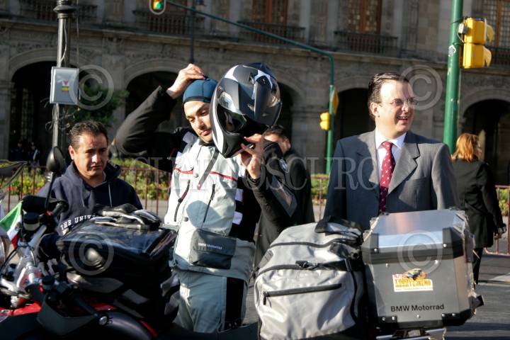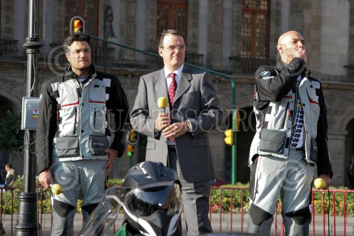 MÉXICO D.F., 05MARZO2009.- Marcelo Ebrard Casaubon jefe de gobierno del Distrito Federal y el actor Javier Poza, durante el banderazo de salida al nuevo programa de Televisa "Aventura por México", en el cual recorrerán toda la república mexicana con rumbo a el bicentenario de la independencia de México FOTO: RICARDO CASTELAN/CUARTOSCURO.COM