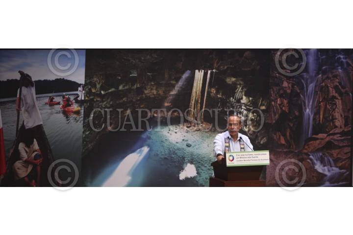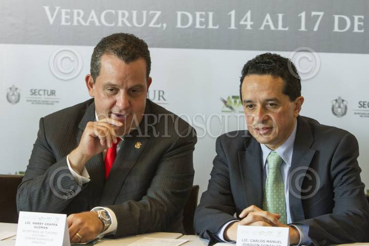 MÉXICO D.F., 03JULIO2013.- Harry Grappa Guzmán, secretario de Turismo y Cultura Cinematográfica de Veracruz, y Carlos Manuel Joaquín González, subsecretario de Turismo federal, encabezaron la conferencia de presentación de ATMEX 2013, Feria de Turismo de Aventura México. FOTO: ISAAC ESQUIVEL /CUARTOSCURO.COM