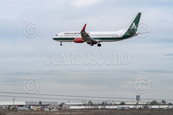 TIJUANA, BAJA CALIFORNIA, 18DICIEMBRE2023.- Iniciaron los vuelos de certificación para la aerolínea del Estado, el vuelo de Mexicana de Aviación MXA1200 operado con el avión tipo Boeing 737-8MC salió del AIFA al aeropuerto internacional de Tijuana. Durante los próximos días se estarán observando las aeronaves en un intenso programa de prueba para poder estar listas para iniciar operaciones el próximo 26 de diciembre. FOTO: OMAR MARTÍNEZ/ CUARTOSCURO.COM