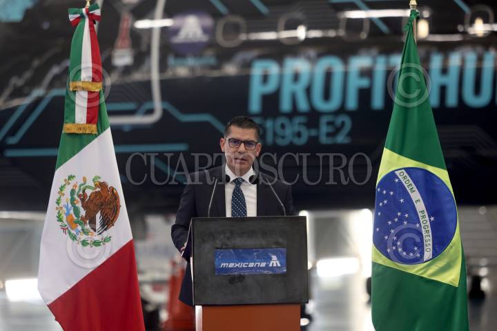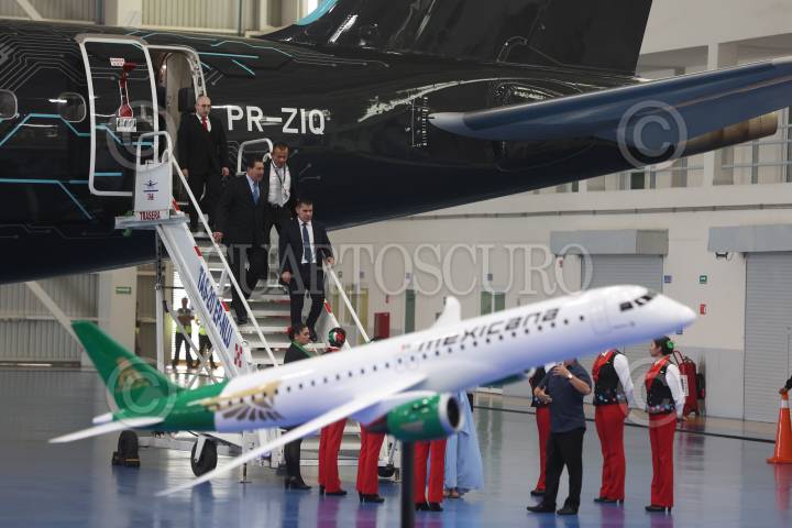 ZUMPANGO, ESTADO DE MÉXICO, 20SEPTIEMBRE2024. Presentación de la aeronave E-195 E2 para la flota de la Aerolínea del Estado Mexicano “Mexicana de Aviación”. La empresa paraestatal adquirirá 20 aviones a la compañía brasileña Embraer con una capacidad de 132 pasajeros, la flota adquirida permitirá iniciar sus primeras rutas internacionales. FOTO: EDGAR NEGRETE LIRA/CUARTOSCURO.COM