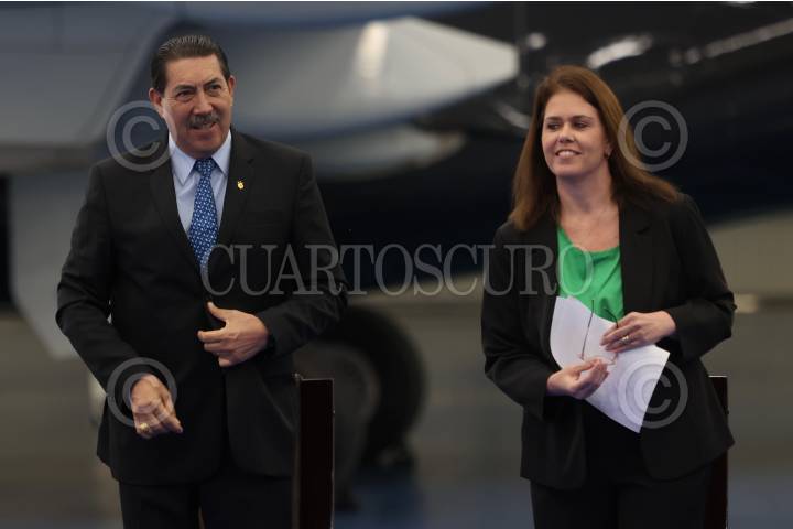 ZUMPANGO, ESTADO DE MÉXICO, 20SEPTIEMBRE2024. El General José Alfredo González Rodríguez Oficial Mayor de la SDN y Priscilla Doro Solymossy Vicepresidenta de ventas y mercadotecnia de Embraer para Latinoamérica durante la presentación de la aeronave E-195 E2 para la flota de la Aerolínea del Estado Mexicano “Mexicana de Aviación”. La empresa paraestatal adquirirá 20 aviones a la compañía brasileña Embraer con una capacidad de 132 pasajeros, la flota adquirida permitirá iniciar sus primeras rutas internacionales. FOTO: EDGAR NEGRETE LIRA/CUARTOSCURO.COM