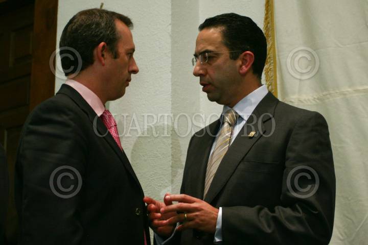 MÉXICO, D.F., 23ENERO2009.- Javier Lozano, Secretario del Trabajo y Alejandro Nava Vélez, Secretario general ASPA de México, durante la asamblea del "Día de la Emancipación del Piloto Aviador" organizado por la Asociación de Pilotos Aviadores de México organizado por la Asociación de Pilotos Aviadores. El evento se realizó en un restaurante de la colonia Polanco. FOTO: MOISÉS PABLO/CUARTOSCURO.COM