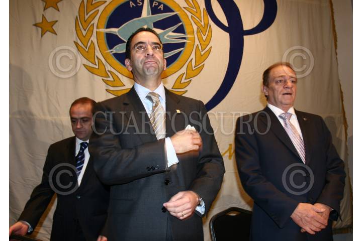 MÉXICO, D.F., 23ENERO2009.- Javier Lozano, Secretario del Trabajo, Salvador Gayón Aguilar, secretario del interior ASPA de México y Gilberto López Meyer, director general de Aeronáutica Civil, durante la conmemoración de la asamblea del "Día de la Emancipación del Piloto Aviador" organizado por la Asociación de Pilotos Aviadores de México organizado por la Asociación de Pilotos Aviadores. El evento se realizó en un restaurante de la colonia Polanco. FOTO: MOISÉS PABLO/CUARTOSCURO.COM