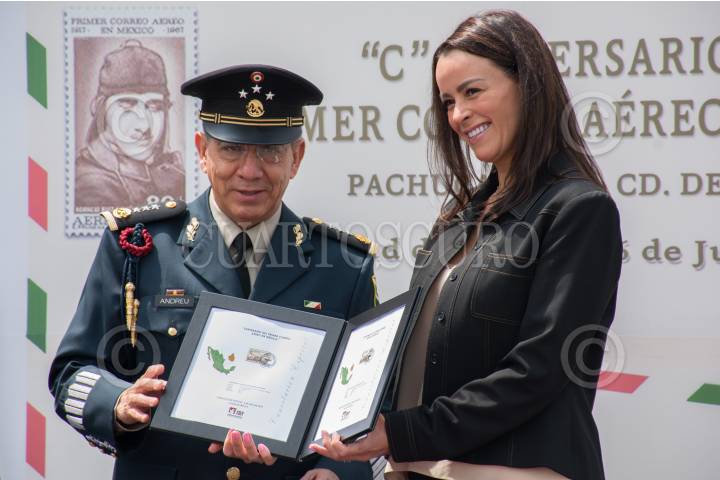 CIUDAD DE MÉXICO, 05JULIO2017.- Gilberto Hernández Andreu, subsecretario de Defensa Nacional, y Cristina Eudave Morán, directiva corporativa comercial del Servicio Postal Mexicano, durante la ceremonia del 100 aniversario del primer correo aéreo en México que llegó en manos del teniente Horacio Ruíz Gaviño, pionero de la aviación militar en México. El correo consistía en una valija ordinaria que contenía 534 cartas y 67 tarjetas procedentes de Pachuca, Hidalgo. FOTO: MARIO JASSO /CUARTOSCURO.COM