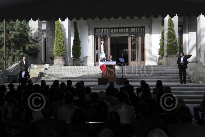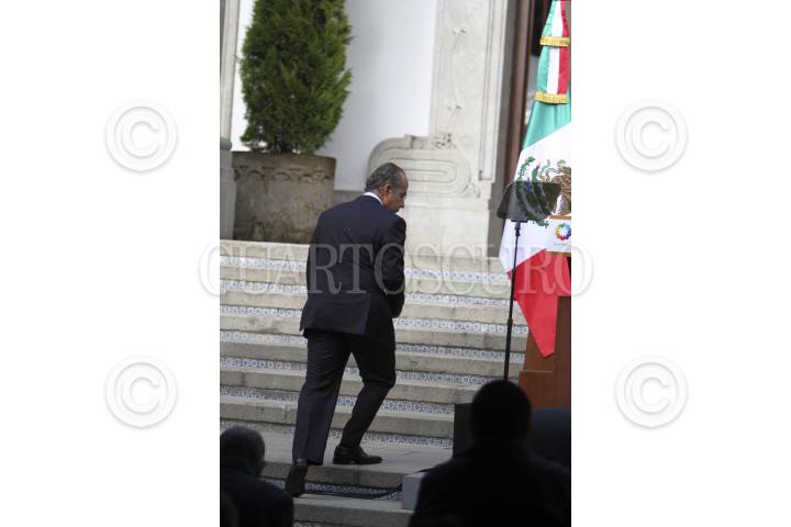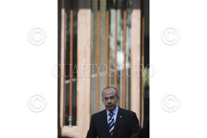 MÉXICO, D.F. 24OCTUBRE2012.- Felipe Calderón Hinojosa, Presidente de México, acompañado de Javier Mayorga Castañeda, titular la Secretaria de Agricultura, Ganadería, Desarrollo Rural, Pesca y Alimentación, ofrecieron el balance del brote de influencia aviar de lata patogenicidad, en la escalinata de la residencia oficial de los Pinos. FOTO: GUILLERMO PEREA /CUARTOSCURO.COM