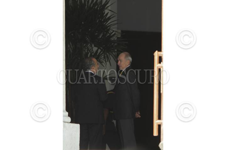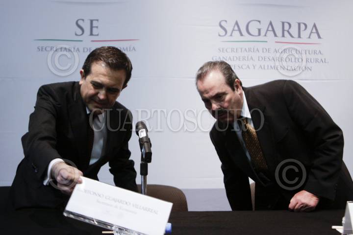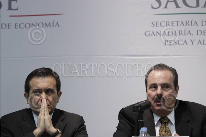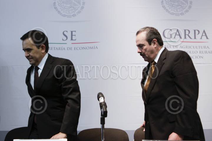 MÉXICO, D.F., 25FEBRERO2013.- Idelfonso Guajardo Villareal, Secretario de Economía; y Enrique Martínez y Martínez, Secretario de Agricultura, Ganadería Desarrollo Rural y Pesca; informaron de manera conjunta sobre el brote de gripe aviar dentro de las instalaciones de la empresa Bachoco. FOTO: IVÁN STEPHENS /CUARTOSCURO.COM