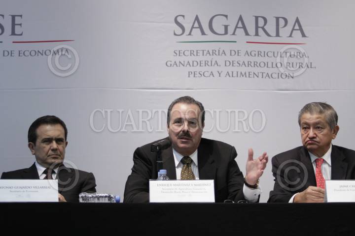MÉXICO, D.F., 25FEBRERO2013.- Idelfonso Guajardo Villareal, Secretario de Economía; Enrique Martínez y Martínez, Secretario de Agricultura, Ganadería Desarrollo Rural y Pesca; y Jaime Crivelli espinoza, Presidente de la Unión Nacional de Avicultores; informaron de manera conjunta sobre el brote de gripe aviar dentro de las instalaciones de la empresa Bachoco. FOTO: IVÁN STEPHENS /CUARTOSCURO.COM