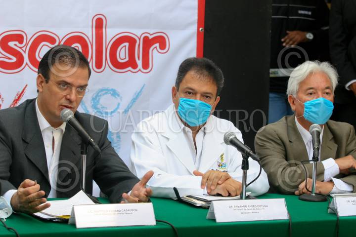 MEXICO D.F. 7MAYO2009. - Marcelo Ebrard jefe de gobierno capitalino, Armando Ahued Ortega, secretario de Salud del Distrito Federa y el secretario de educación pública del Distrito federal Axel Dridiksson, durante la presentacion del programa emergente de apoyo escolar, "Limpieza y salud" que se realizo en el centro de Desarrollo Infantil, en la colonia providencia, delegacion Gustavo A. Mdero. FOTO:RICARDO CASTELAN/CUARTOSCURO.COM