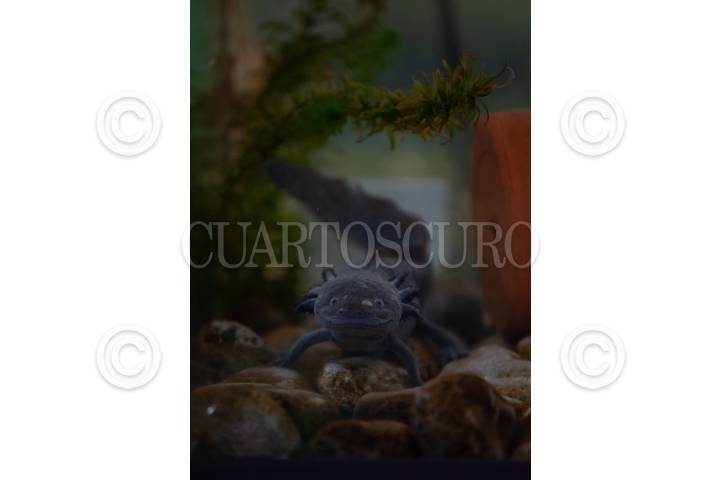 Un Axolote dentro de su estanque es observado por los visitantes.