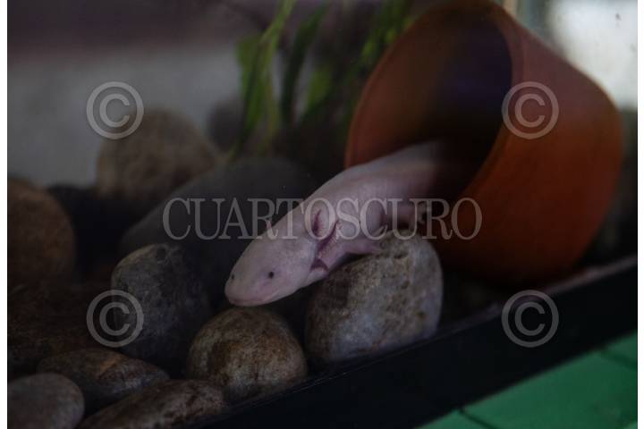 Un axolote nada dentro de su estanque en el Museo del Axolote.