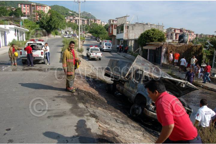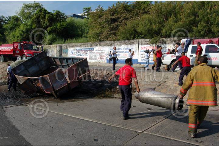 ACAPULCO, GUERRERO, 26AGOSTO2009.- Elementos de Protección civil apagaron un camión de la empresa Hidno-Gas que ardió en llamas en la gran vía de la unidad habitacional El Coloso de Acapulco, donde estudiantes de una escuela primaria y vecinos tuvieron que ser desalojados por el peligro que representa, las autoridades no reportaron muertos ni heridos. FOTO: MARINO D. VALDEZ/CUARTOSCURO.COM