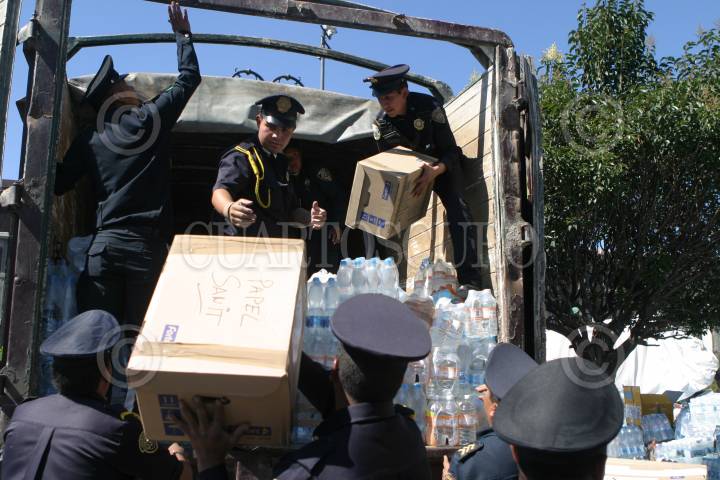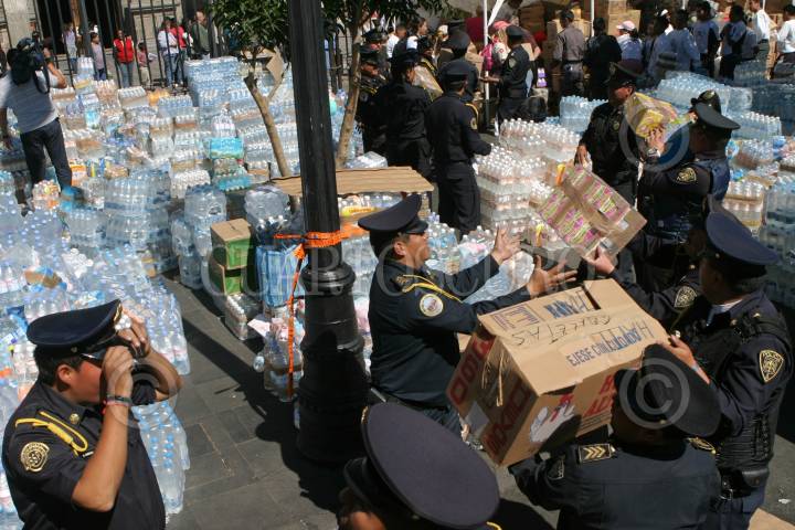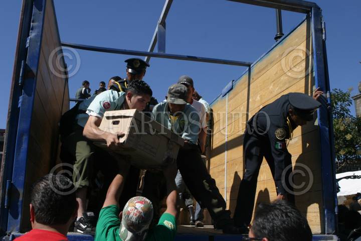 MÉXICO, D.F., 17ENERO2010.- Los víveres recolectados para ayudar a el pueblo haitiano que sufre por la destrucción que dejo un sismo de 7 grados richter, en el centro de acopio ubicado a un costado de la Catedral Metropolitana fueron transportados en dos camiones con destino a el aeropuerto en donde serán trasladados a la isla caribeña. FOTO: MOISÉS PABLO/CUARTOSCURO.COM