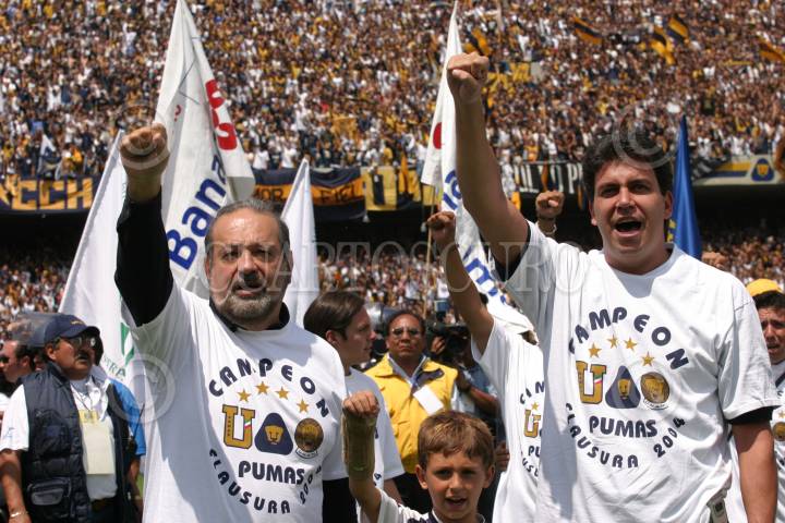 México, d.F. 08 AGOSTO 2004.- Al centro Francisco ¨kikin¨Fonseca, delantero de los Pumas de la Universidad y Arturo Elías Ayud, presidente del patronato, levantan el trofeo que dicho equipo le ganó al Pachuca con un marcador global de 7 goles a 3 en el partido de campeón de campeones. FOTO: Sandra Perdomo/CUARTOSCURO.COM