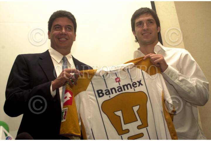 MEXDF20JULIO2004.- Arturo Elías Ayub, presidente del equipo de los Pumas de la Universidad de México durante la presentación del jugador uruguayo Diego Alonso que tomará el lugar de Bruno Marioni . FOTO: Eunice Adorno/CUARTOSCURO.COM