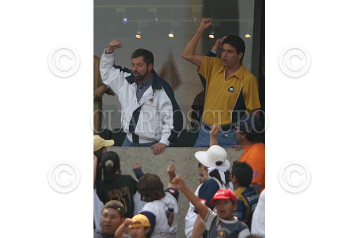 México, D.F. 08 AGOSTO 2004.- Hugo Sánchez, director técnico de los Pumas de la Universidad celebra el triunfo del partido campeón de campeones 2004 con Arturo Elías Ayud, presidente del patronato. FOTO: Sandra Perdomo/CUARTOSCURO.COM