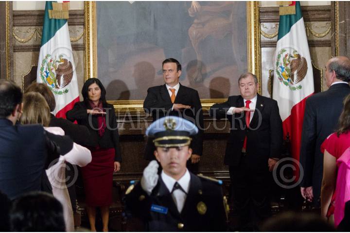 MÉXICO, D.F., 03ENERO2012.- El magistrado Edgar Elías Azar, durante su toma de protesta como presidente del Tribunal Superior de Justicia del Distrito Federal acompañado de Marcelo Ebrard, jefe de gobierno del Distrito Federal y de la asambleísta Alejandra Barrales que se realizo en el salón de plenos públicos del TSJDF. FOTO: RODOLFO ANGULO/CUARTOSCURO.COM