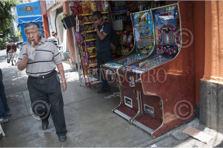 MÉXICO, D.F., 18ABRIL2015.- Señores se entretienen e intentan multiplicar su dinero que han depositado en las máquinas tragamonedas ubicadas afuera del metro Tacuba. FOTO: DIEGO SIMÓN SÁNCHEZ /CUARTOSCURO.COM