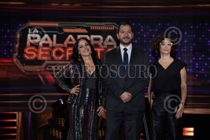 Lola Crtés acompañada de Adrián Ortega, Director General de contenidos de TV Azteca y Coty Cagliolo, Directora General de Fremantle Media para Latinoamérica durante la presentación del programa de concursos "Password, La Palabra Secreta" en Azteca Es