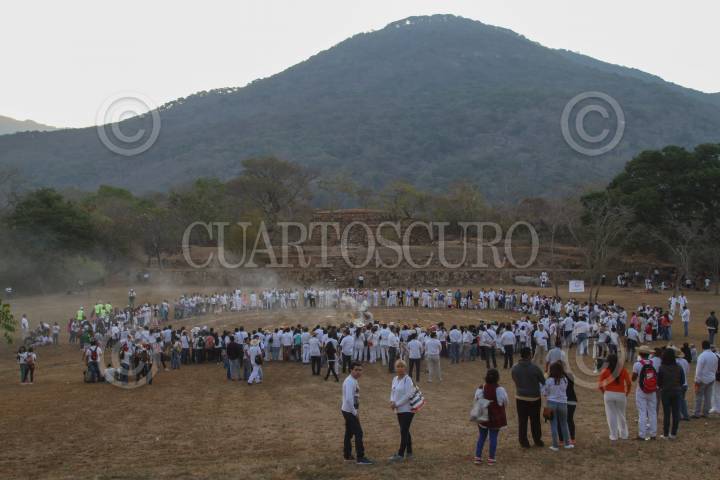 ACAPULCO, GUERRERO, 22MARZO2017.- E día de ayer Hombres y mujeres de todaslas edades, llevados por el gobierno del estado, recibieron el equinoccio de primavera en la zona arqueológica de Tehuacalco, sitio ceremonial Yope asentado en el municipio de Tierra Colorada. Con danzas aztecas y guerrerenses, tambores y olor a copal recibieron los primeros rayos del sol con las manos alzadas y el rostro frente al astro con el propósito de recargar energías al inicio de este nuevo ciclo. FOTO: BERNANDINO HERNÁNDEZ / ARCHIVO /CUARTOSCURO.COM