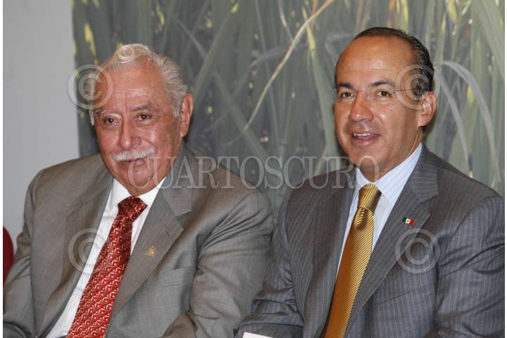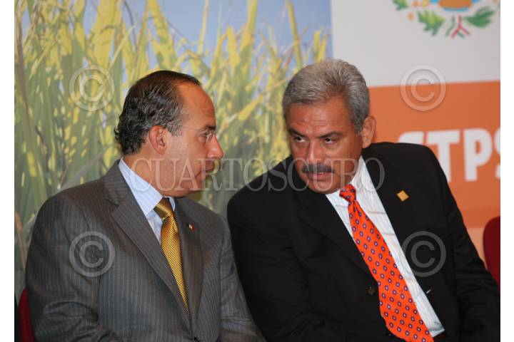 MÉXICO, D.F. 30AGOSTO2007.- Enrique Ramos Rodríguez, secretario general del sindicato de trabajadores de la industria azucarera y similarese de la República Mexicana y Felipe Calderón Hinojosa, Presidente de la República, durante la presentación del nuevo contrato de modernización de la ley de la industria azucarera. FOTO: CLAUDIA ARÉCHIGA/CUARTOSCURO.COM