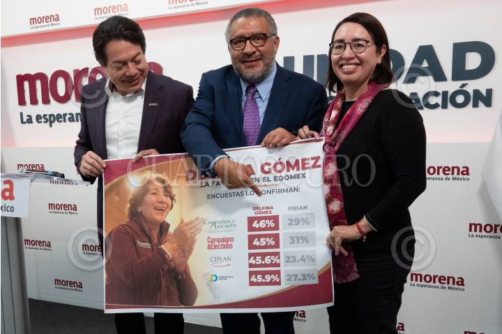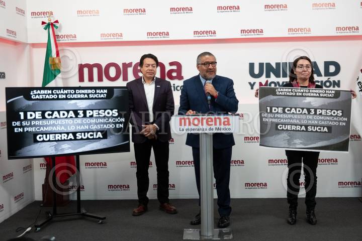 Mario Delgado, presidente Nacional de Morena; Horacio Duarte, coordinador de campaña de Delfina Gómez, y Azucena Cisneros, diputada de Ecatepec, ofrecieron una conferencia de prensa en la CEN de Morena