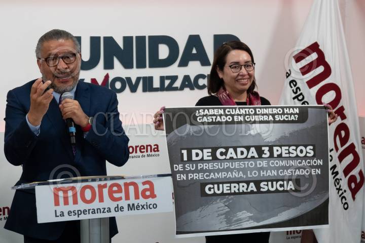 Horacio Duarte, coordinador de campaña de Delfina Gómez, y Azucena Cisneros, diputada de Ecatepec, durante su participación en una conferencia de prensa en la CEN de Morena