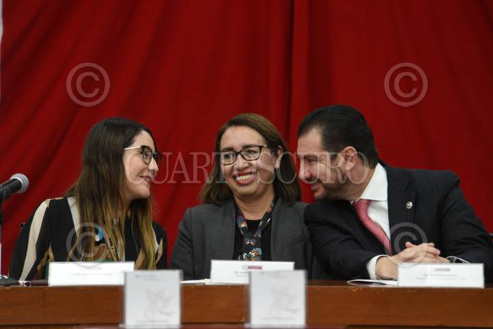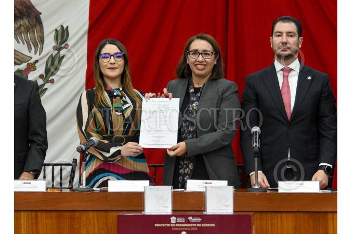 TOLUCA, ESTADO DE MÉXICO, 21NOVIEMBRE2023.- Paulina Moreno García Secretaria de Finanzas del Estado de México, la diputada Azucena Cisneros presidenta de la Mesa Directiva y Elias Rescala presidente de la JUCOPO durante la entrega del Paquete Fiscal 2024 del Gobierno del Estado de México. FOTO: CRISANTA ESPINOSA AGUILAR /CUARTOSCURO.COM