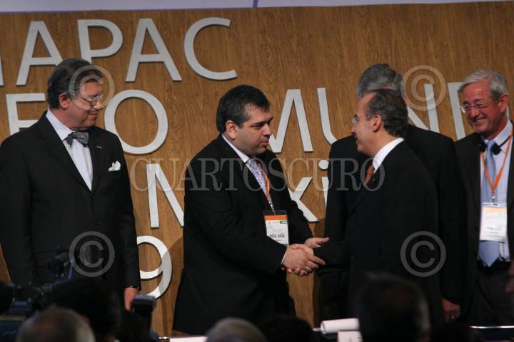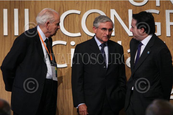 MÉXICO, D.F., 012OCTUBRE2009.- El ministro Mariano Azuela Guitrón, Paulino Rivera, presidente de las uniones Sociales de Empresarios de México y de la Ciudad de México; Pierre Lecocq, presidente de la Unión Internacional Cristiana de Empresas en Europa y Lorenzo Servitje Sendra, Fundador de Grupo BIMBO durante la XXIII Congreso Mundial UNIAPAC.. FOTO: IVAN STEPHENS/CUARTOSCURO.COM