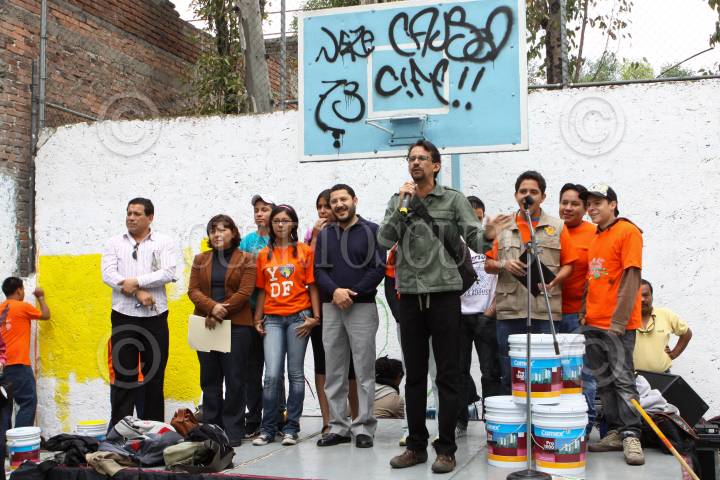 MÉXICO, D.F., 25SEPTIEMBRE2010.- Javier Hidalgo, director del Instituto de la Juventud del D.F., estuvo presente durante la realización de un mural para conmemorar la celebración del X Aniversario de la Ley de las y los Jóvenes y los 14 derechos de las y los jóvenes en la calle de Eje 1 Norte José María Alzate y Mariano Azuela en la colonia Buenavista. FOTO: RODOLFO ANGULO/CUARTOSCURO.COM