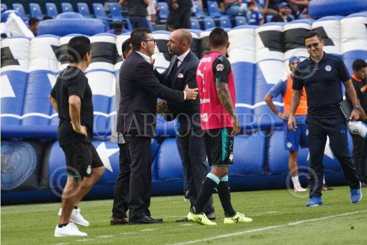 CIUDAD DE MÉXICO, 16SEPTIEMBRE2017.- Con goles de Felipe Mora y Christián "Chaco" Giménez, la Máquina de Cruz Azul ganó 2-1 en casa al Club Santos, en partido de la jornada 9 del Apertura 2017. En la imagen los técnicos Jose Manuel de la Torre y Francisco Jemez platican al final del encuentro, el cual termino con tres expulsados del equipo visitante. . FOTO: ISAAC ESQUIVEL /CUARTOSCURO.COM