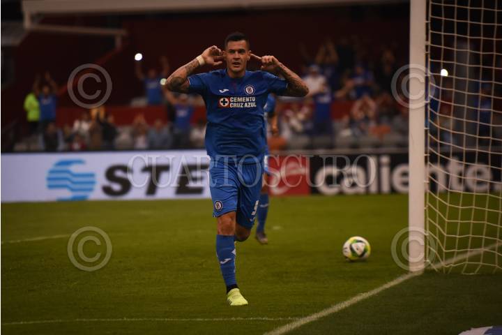CIUDAD DE MÉXICO, 16MARZO2019.- En partido correspondiente a la Jornada 11 del Clausura 2019, la máquina celeste del Cruz Azul se enfrontó a los Tuzos del Pachuca en el estadio Azteca, el marcador fue favorable para los capitalinos con un resultado final de 4-1. En la foto, Pablo Aguilar, del equipo celeste festeja la cuarta anotación de los cementeros. FOTO: PEDRO ANZA /CUARTOSCURO.COM