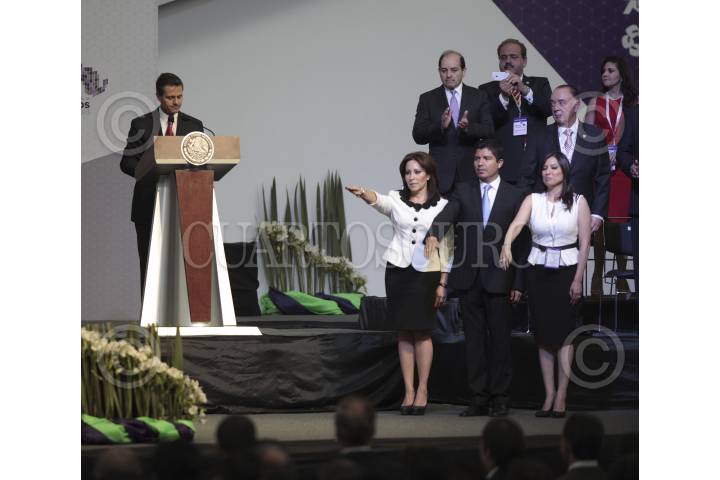 LEÓN, GUANAJUATO, 16MAYO2013.- El presidente Enrique Peña Nieto encabezó la Conferencia Anual de Municipios 2013 que reunió a alcaldes de distintas fuerzas políticas y organizaciones. En la imagen Bárbara Botello Santibañez, presidenta de la Federación Nacional de Municipios de México, Eduardo Rivera Pérez, presidente de la Conferencia Nacional de Municipios y de la Asociación Nacional de Alcaldes y presidente municipal de la Heroica Puebla de Zaragoza, Puebla y Leticia Quezada Contreras, presidenta de la Asociación de Autoridades Locales de México A.C. FOTO: CUARTOSCURO.COM