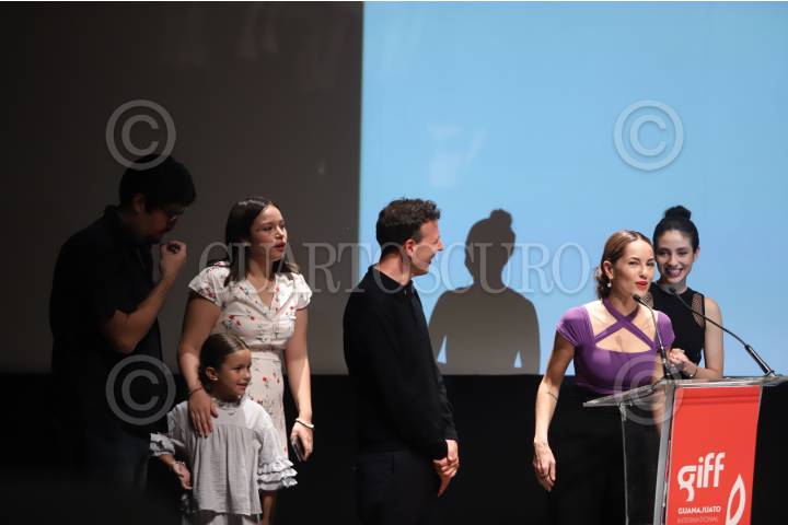 Fernando Bonilla, María Fernanda Osio, Amat Escalante y Bárbara Mori durante la presentación de la muestra especial “Perdidos en la noche”, del director Amat Escalante, dentro de las actividades del Festival Internacional de Cine Guanajuato (GIFF) en su edición número 26.