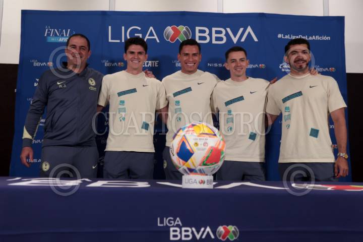 CIUDAD DE MÉXICO, 21MAYO2025. André Jardine, Israel Reyes, Luis Ángel Malagon, Álvaro Fidalgo y Henry Martín del Club América durante el día de medios de la final de la Liga BBVA MX en un hotel al sur de la Ciudad de México. FOTO: EDGAR NEGRETE LIRA/CUARTOSCURO.COM
