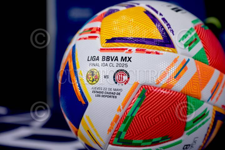 CIUDAD DE MÉXICO, 21MAYO2025. Aspecto del balón oficial con el que se jugará la final entre Toluca y América durante el día de medios de la final de la Liga BBVA MX en un hotel al sur de la Ciudad de México. FOTO: EDGAR NEGRETE LIRA/CUARTOSCURO.COM