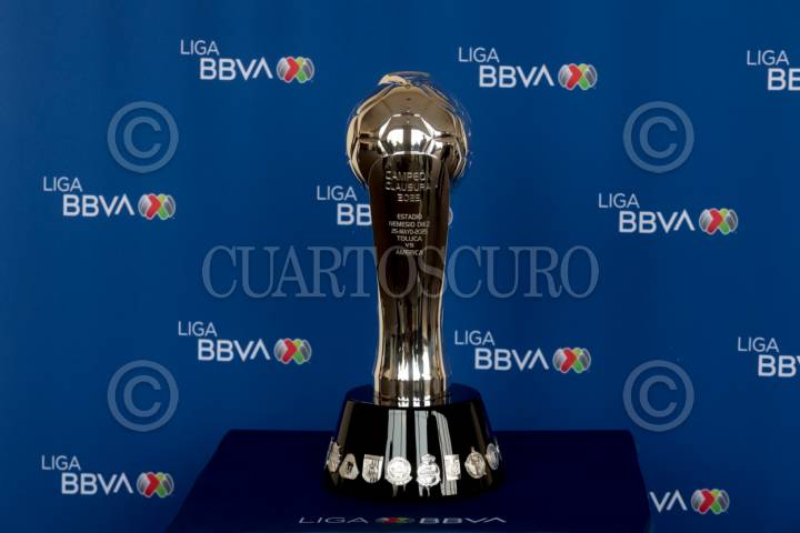 CIUDAD DE MÉXICO, 21MAYO2025. Aspecto del trofeo de campeón del Torneo Clausura 2025 durante el día de medios de la final de la Liga BBVA MX en un hotel al sur de la Ciudad de México. FOTO: EDGAR NEGRETE LIRA/CUARTOSCURO.COM