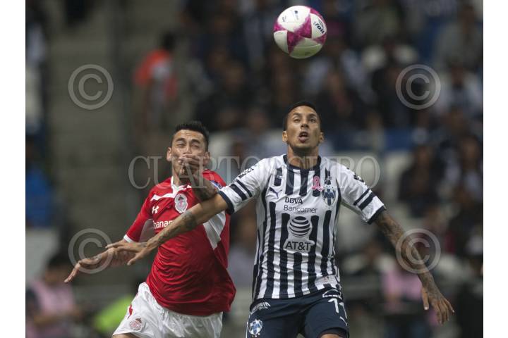 MONTERREY, NUEVO LEÓN, 20OCTUBRE2018.- Carlos Rodríguez del equipo de los Rayados del Monterrey, se disputa el balón con Osvaldo González del equipo de los Diablos Rojos del Toluca, en el estadio BBVA Bancomer, partido correspondiente a la jornada 13 de la Liga MX, Apertura 2018. Marcador Final: Monterrey: 2 - Toluca: 1 FOTO: GABRIELA PÉREZ MONTIEL /CUARTOSCURO.COM