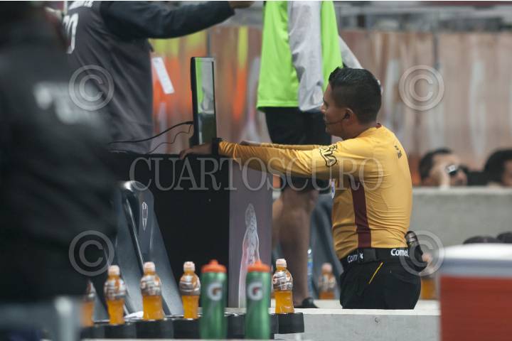 MONTERREY, NUEVO LEÓN, 20OCTUBRE2018.- El árbitro del partido, utiliza el VAR por primera vez en la Liga Mexicana, para despejar la duda sobre el gol de Toluca, en su encuentro con los Rayados del Monterrey, en el estadio BBVA Bancomer, partido correspondiente a la jornada 13 de la Liga MX, Apertura 2018. Marcador Final: Monterrey: 2 - Toluca: 1 FOTO: GABRIELA PÉREZ MONTIEL /CUARTOSCURO.COM