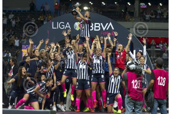 Jugadoras del equipo de las Rayadas del Monterrey, levantan la copa tras el triunfo sobre el Club Tigres Femenil, donde el global fue de 2-1 a favor del equipo local, en el estadio BBVA Bancomer, partido correspondiente a la final de la Liguilla, Apertura 2019. FOTO: GABRIELA PÉREZ MONTIEL /CUARTOSCURO.COM