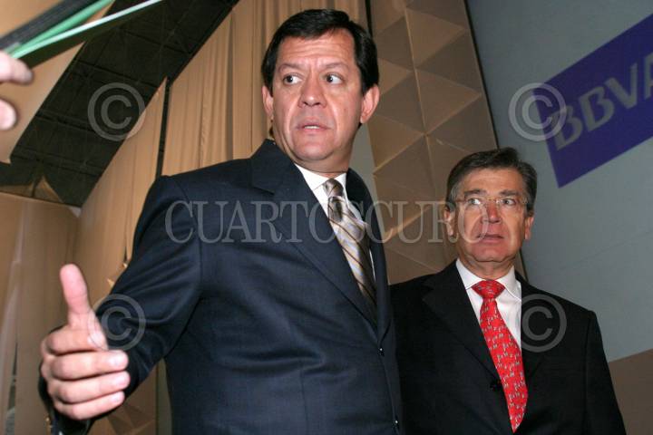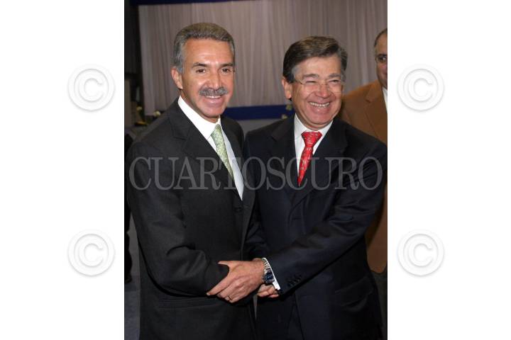 MEXICO, D.F., 07FEBRERO2006.- Roberto Madrazo, candidato presidencial por la Alianza por México PRI-PVEM y Angel Rangel Domene, durante la reunión consejeros nacionales del BBVA-Bancomer en la Expo-Bancomer. FOTO: Moisés Pablo/CUARTOSCURO.COM