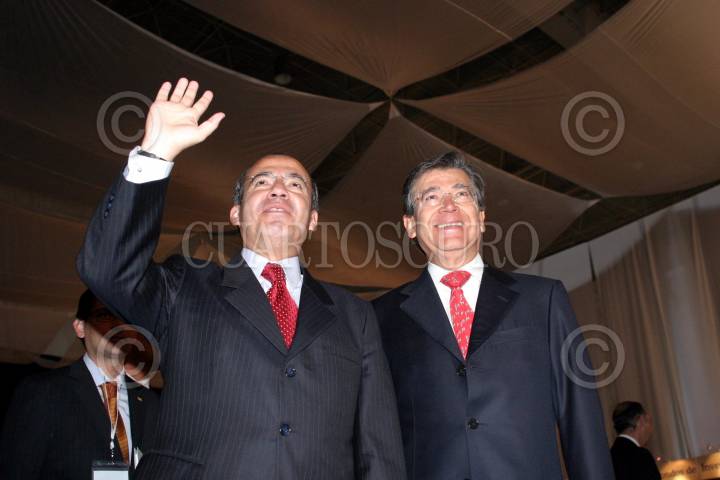 MEXICO, D.F., 07FEBRERO2006.- Felipe Calderon, candidato a la presidencia de la República por el PAN y Angel Rangel Domene, durante la reunión consejeros nacionales del BBVA-Bancomer en la Expo-Bancomer. FOTO: Moisés Pablo/CUARTOSCURO.COM