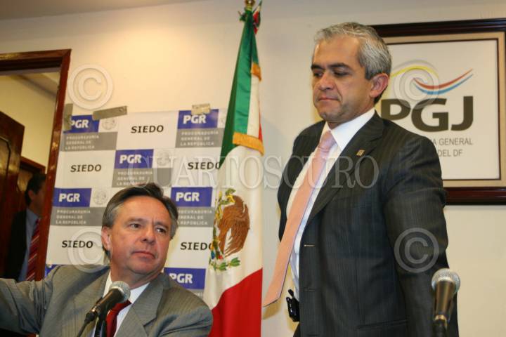MÉXICO D.F., 20OCTUBRE2008.- Eduardo Mediana Mora, Procurador General de la República, acompañado de Miguel Ángel Mancera Procurador General de Justicia del D.F. en conferencia de prensa confirmaron que entre los detenidos de esta tarde después del enfrentamiento de esta tarde en la delegación Gustavo A. Madero, se encuentra Jesús Zambada Reyes, presunto sobrino de Ismael El Mayo Zambada; además de Carlos Castillo Ramírez, elemento de la Agencia Federal de Investigación AFI, Guillermo Baez Figueroa, de la Policía Federal, y Álvaro Montaño Ochoa, agente ministerial del estado de México, los cuales fueron presentados después de la conferencia . FOTO: RICARDO CASTELAN/CUARTOSCURO.COM