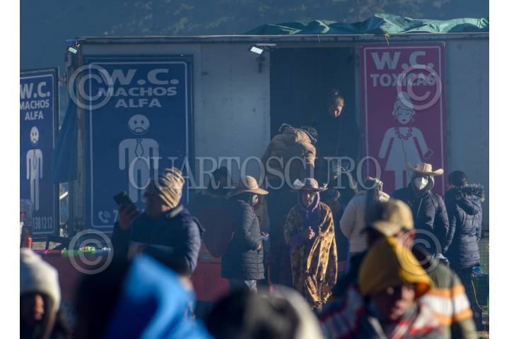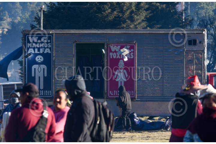 OCOYOACAC, ESTADO DE MÉXICO, 20FEBRERO2024.- Aspectos de baños públicos instalados en La Marquesa para peregrinos, con letreros poco usuales. FOTO: CRISANTA ESPINOSA AGUILAR /CUARTOSCURO.COM
